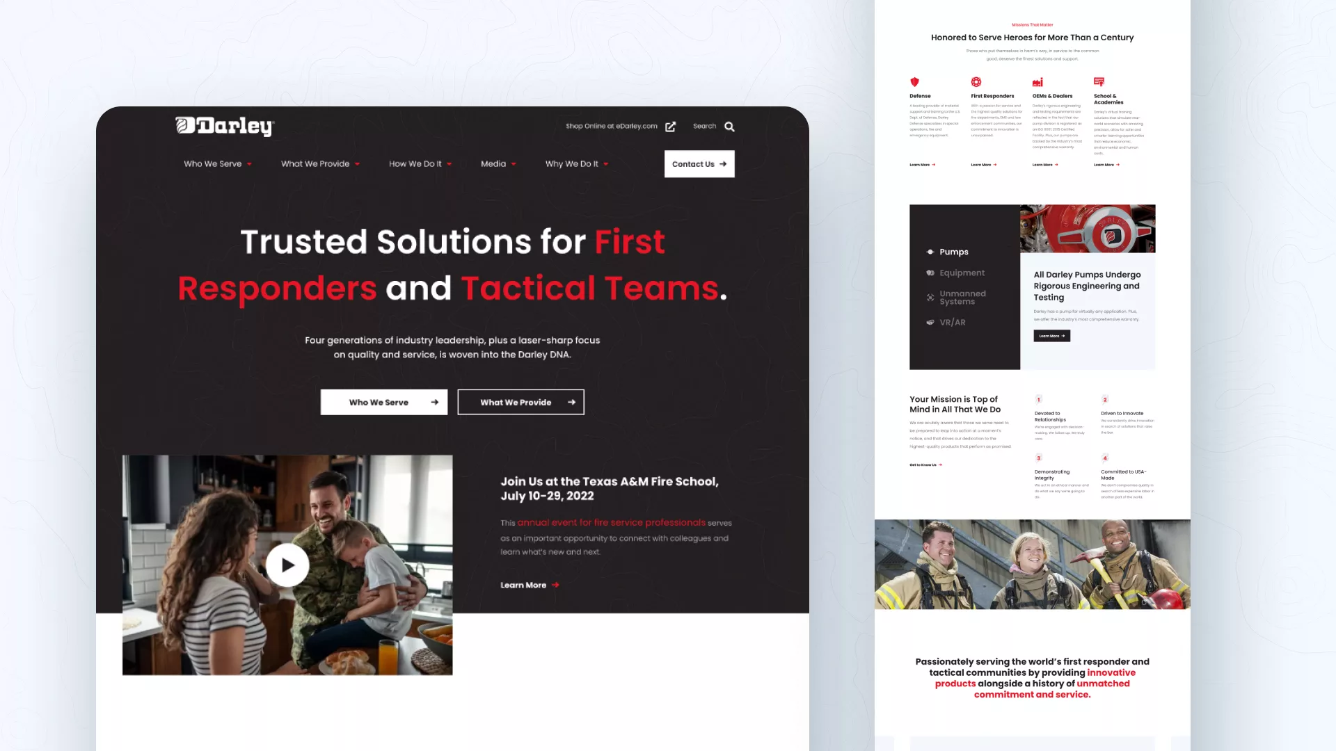 The 113-year-old company founded (and still run) by the Darley Family needed some strategy, organization, and a plan for digital marketing, along with a partner to help them get it done. Darley (for first responders) and Darley Defense (for military) had been serving multiple audiences through multiple websites and needed to better show their modern technical knowledge of the industries they serve (and numerous products and services within them) while maintaining the branding and messaging around their hard-fought values.